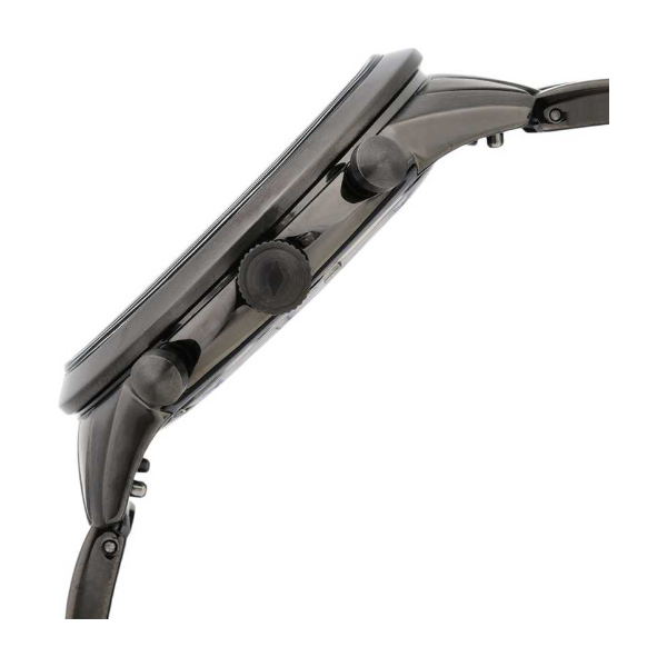 Grey stainless steel case and bracelet. Fixed grey stainless steel bezel. Black dial with luminous silver-tone hands and index hour markers. Minute markers around the outer rim. Dial Type: Analog. Luminescent hands and markers. Chronograph - two sub-dials displaying: 60 second, 60 minute.