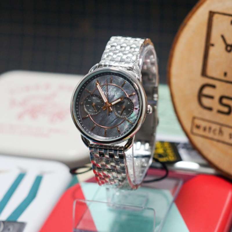 Fossil ES3911Tailor Women's Watch - Silver, an analog watch designed exclusively by combining a silver stainless steel case & bracelet and Black Mother of Pearl dial. This watch has a special appearance with chrono eyes on the center dial, silver bezel and rose gold numeral index, and uses a Japan Quartz movement and is 50 m water resistant. Diameter 35mm.