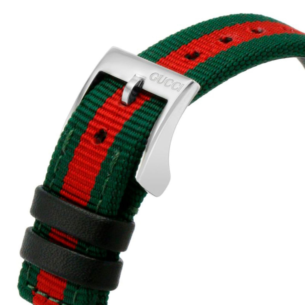 - Classic green/red/green stripe dial face features brand name and bee motif markers at 3, 6, and 9 o'clock.