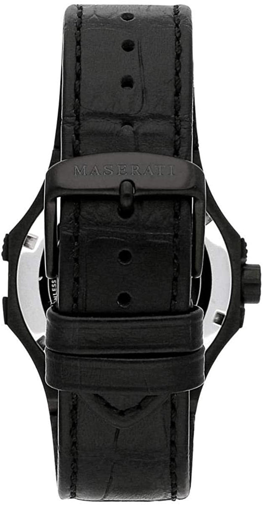 MASERATI watch POTENZA - R8821108027 - Case Material & Finish: Stainless Steel, Case width: 52x40mm, Strap Material: Leather strap, Strap Colour: Black, Dial Colour: Black, Water resistant: 10ATM, Crystal: Mineral crystal, Material: Stainless Steel, Case thickness: 13.30, Gender: Male, Buckle: Pin buckle, Guarantee: Maserati 2 years guarantee, Packaging: Maserati original packaging