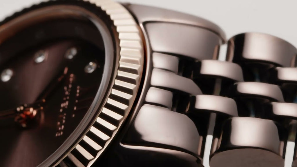 - Round stainless steel case, with a brown dial.