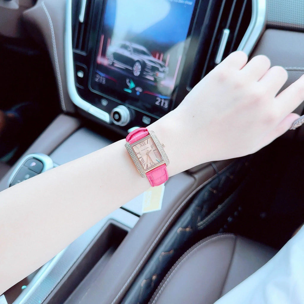 Our 33mm Emery features a stunning rose gold-tone stainless steel shaped-case. With a pavé topring and geranium pink croco leather strap, this watch has the perfect touch of sparkle.