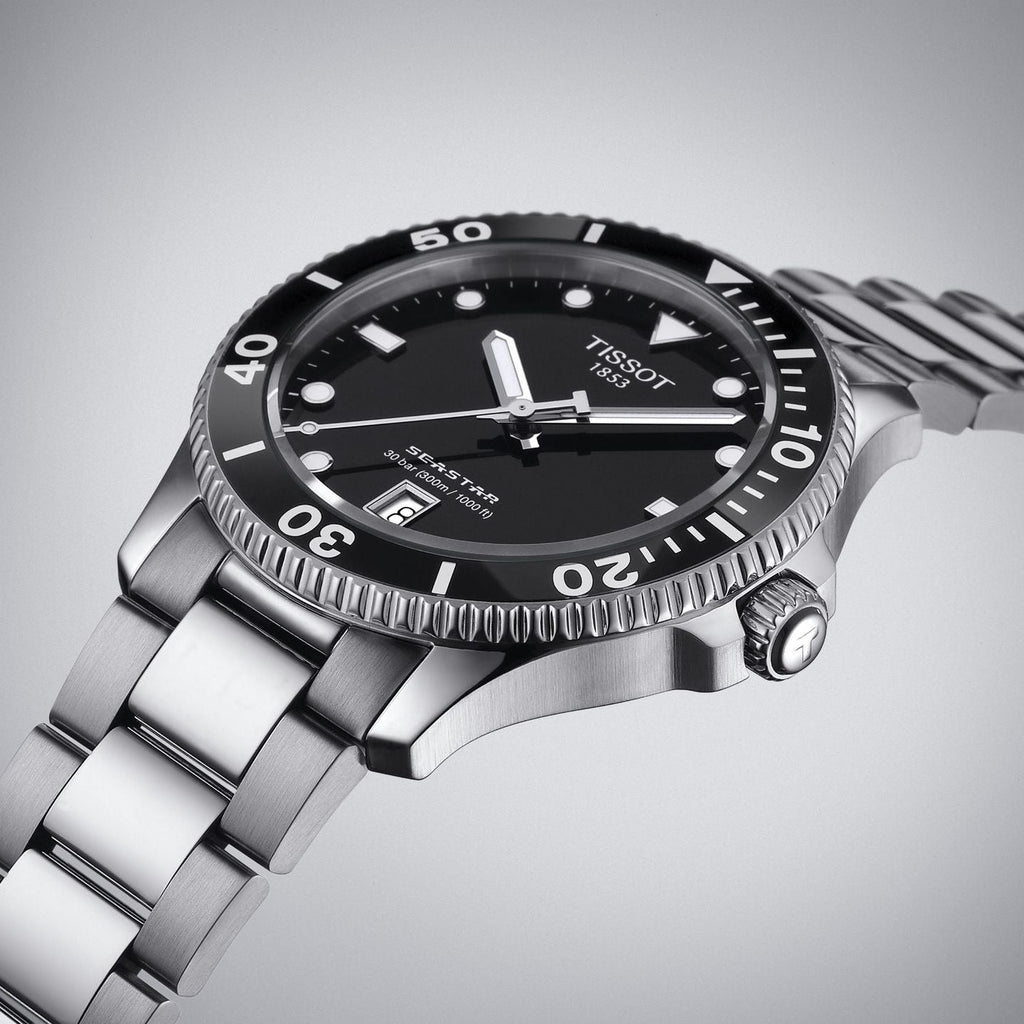 Tissot T120.410.11.041.00 Sea Star 1000 Metal Bad Men Watch. The case is made out of silver stainless steel with a blue bezel, which stands for the high quality of the item, it has a blue dial. This model has got 300 meters of water resistance. it can be worn in scenarios where it is likely to be splashed but not immersed in water and will be fine in rain. The watch is shipped with an original box and a guarantee from the manufacturer.