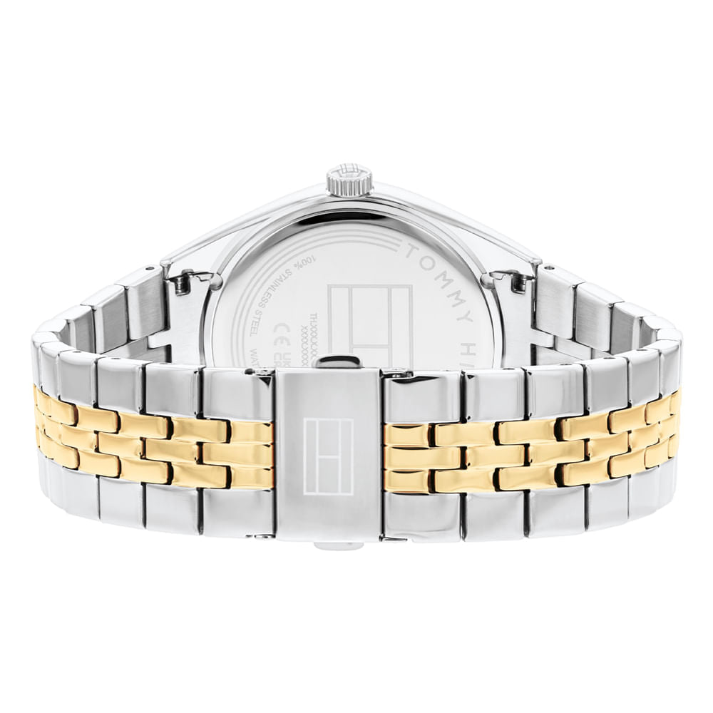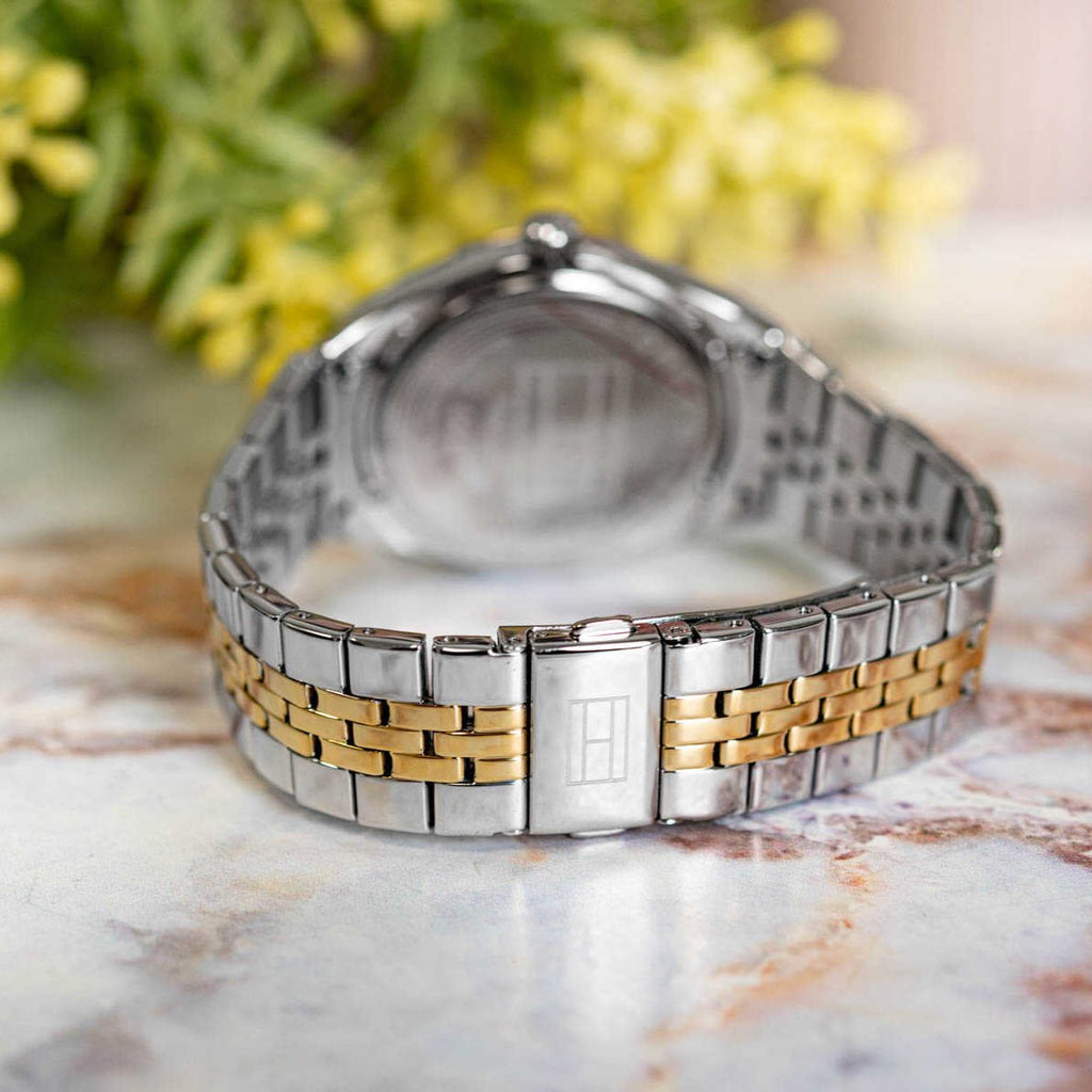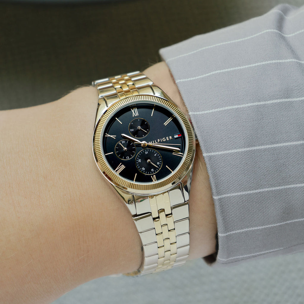 Dress to impress with this Tommy Hilfiger women's silver and gold watch with a black dial. A coin-edged texture on the bezel and a dial with Roman numerals make this timeless piece an essential accessory for your look. The perfect watch for a confident woman who knows what she wants.