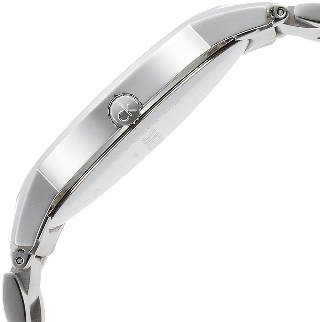 This men's Calvin Klein City watch is made from stainless steel and is fitted with a quartz movement. It is fitted with a silver metal bracelet and has a blue dial.