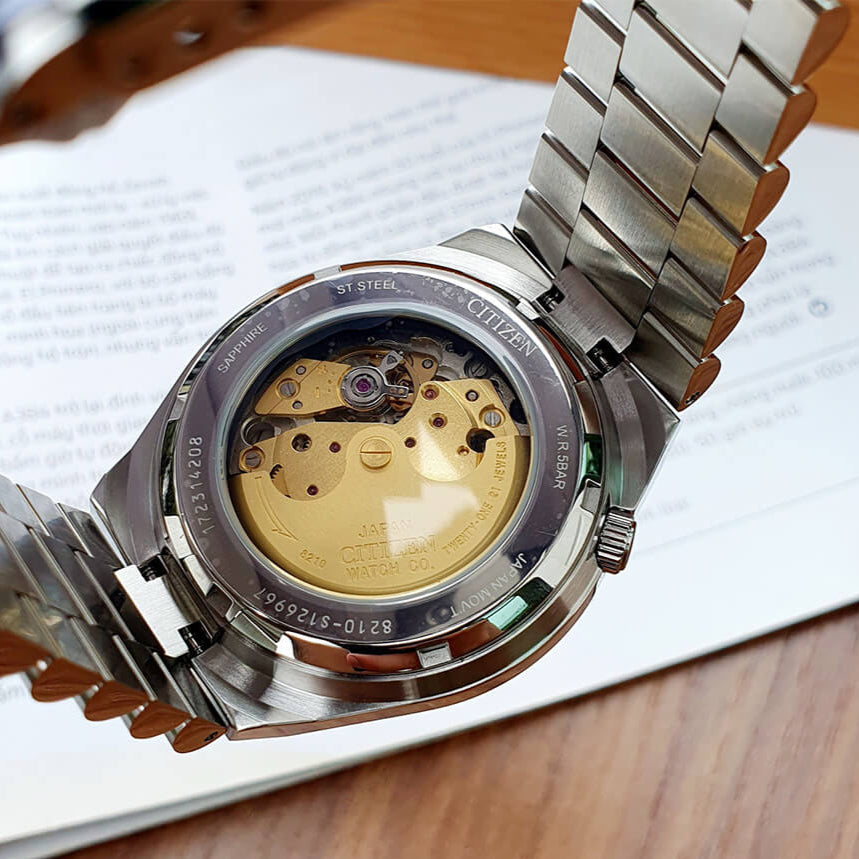 The Tsuyosa NJ0150-81A is powered by the Citizen 8210 mechanical automatic movement. Powered by the release of a wound spring, mechanical movements never require a battery. Automatic mechanical movements have an oscillating weight that winds the spring with the motion of the wearer’s arm. The 8210 features 21 jewels and beats at 21,600 vph (3 Hz) and has a power reserve of 40 hours once fully charged.