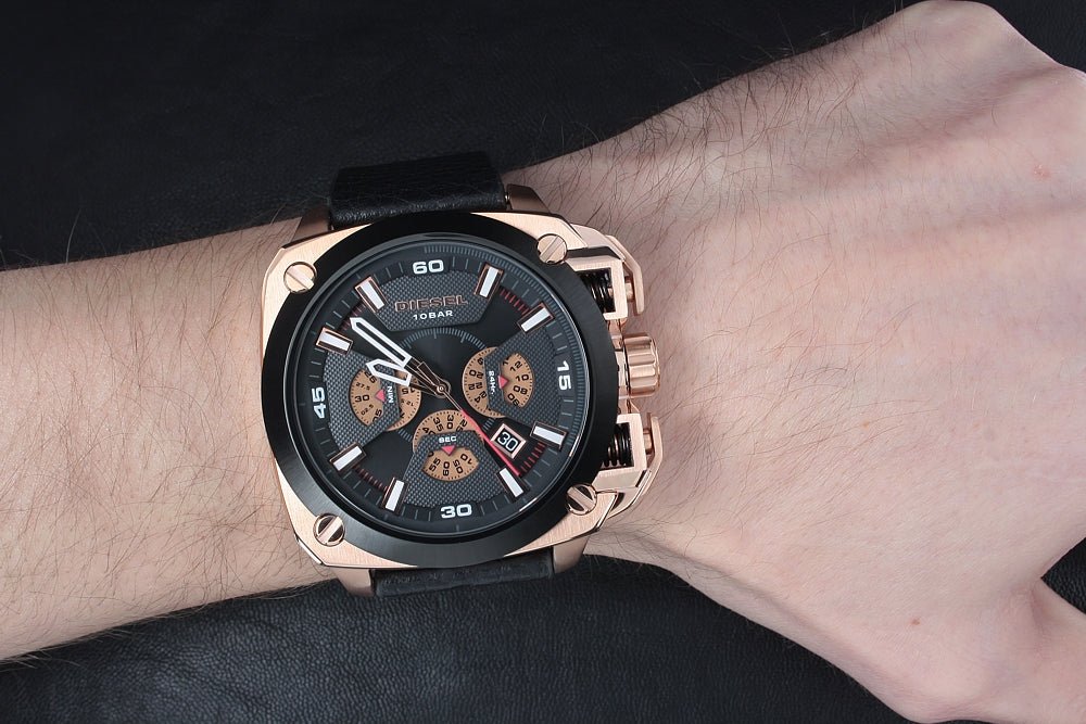 Combining an impressive Rose Gold Stainless Steel case, a Black Genune Leather strap and Black textured chronograph dial, Diesel men’s collection showstopper BAMF brings big attitude and even bigger style.