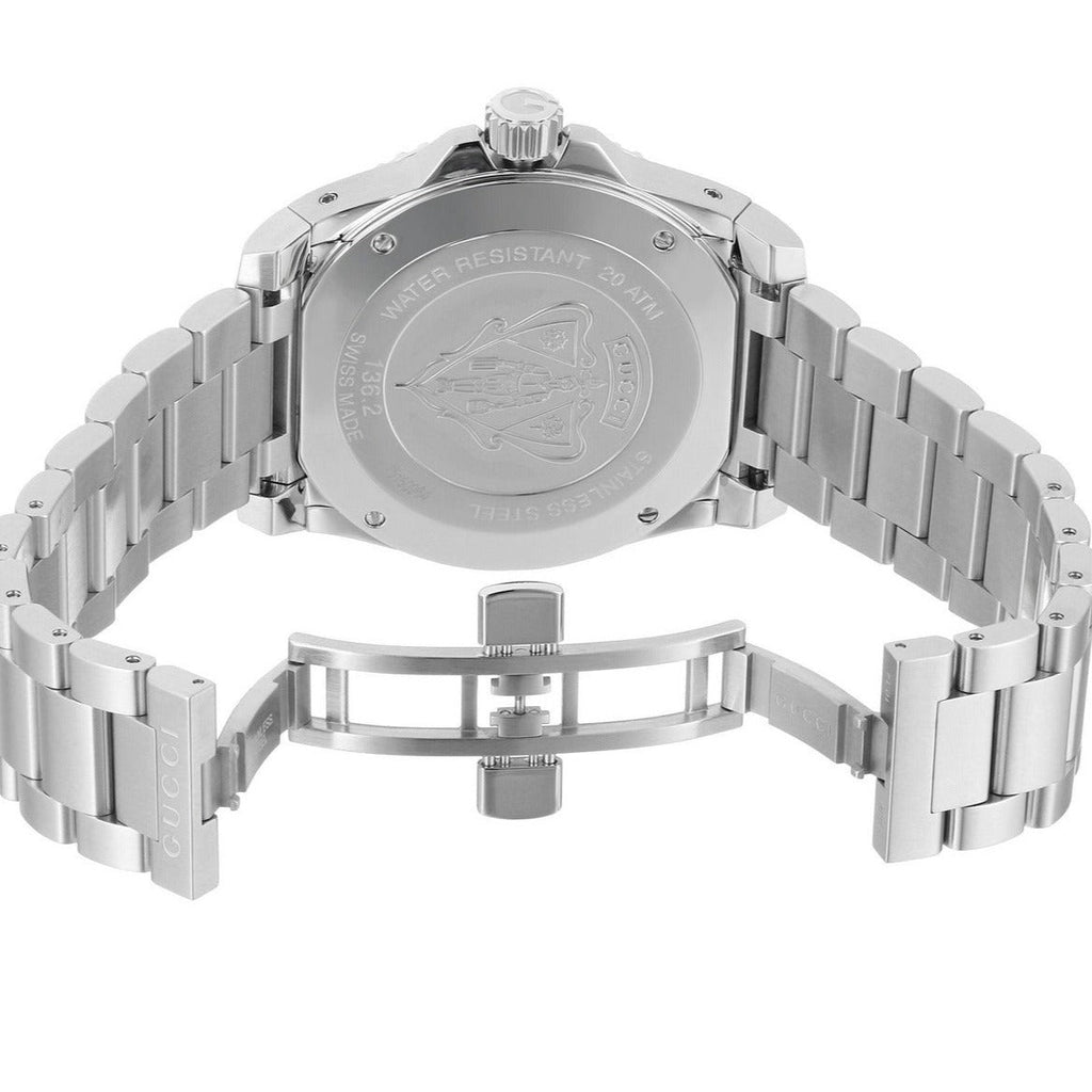 Date display at the 6 o'clock position. Quartz movement. Scratch resistant sapphire crystal. Solid case back. Case diameter: 45 mm. Case thickness: 12 mm. Round case shape. Band width: 23 mm. Fold over clasp with a double push button release. Water resistant at 200 meters / 660 feet. Functions: date, hour, minute, second. Casual watch style. Gucci Dive Blue Dial Stainless Steel Men's Watch YA136203.