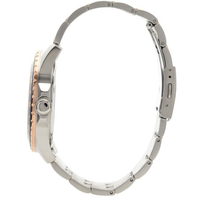 Crafted with precision, this watch from Guess is a must-have in every man's watch collection. The navy round dial is housed in a 44 mm case. It exhibits three subdials, unique hour markings, and a crown for time adjustment. The stainless steel strap exudes an elegant silver and rose gold hue that accentuates the look of the watch. Moreover, it is equipped with a push-button clasp to ensure a secure fit on the wrist.
