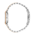Rose gold-tone stainless steel case with a two-tone (silver-tone and rose gold-tone) stainless steel bracelet. Fixed rose gold-tone stainless steel bezel. Silver-tone dial with rose gold-tone hands and index hour markers. Dial Type: Analog. Quartz movement. Scratch resistant mineral crystal. Pull / push crown.