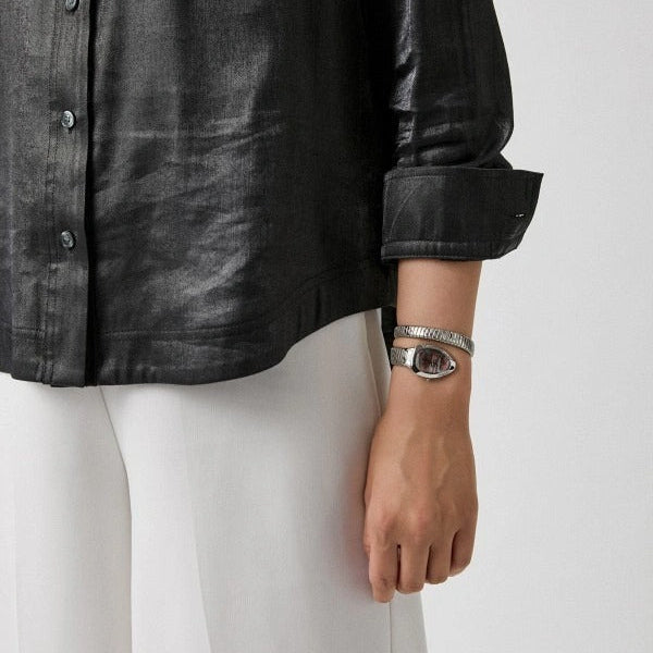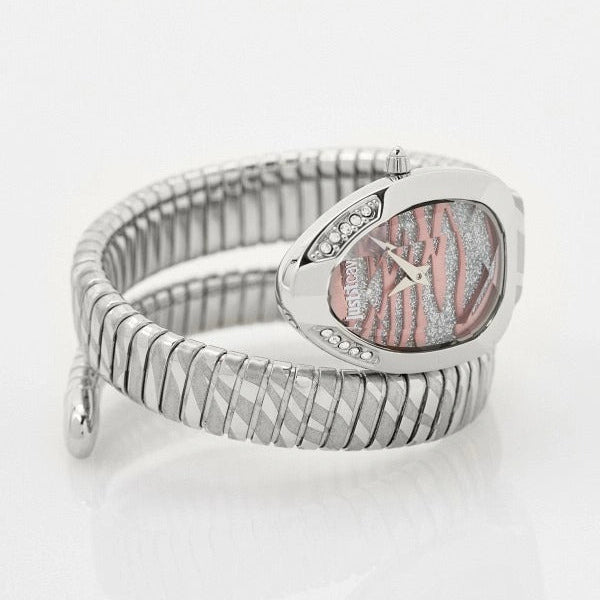 With its snake-shaped design wrapped around your wrist, this Just Glam Evo 8 watch will always be the center of attention. This bracelet watch features a snake-shaped case and a flexible tubular spiral bracelet. The case is adorned with Swarovski crystals. The winding crown is conical.