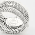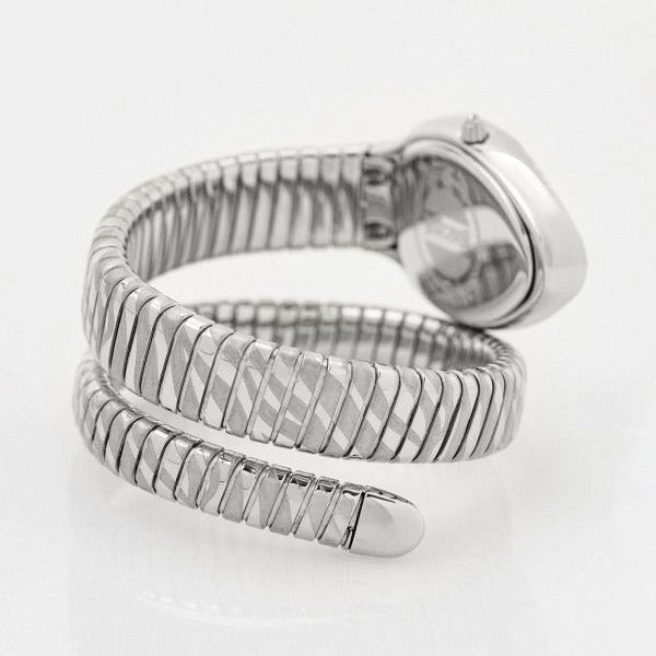 This bracelet watch features a snake-head-shaped case and a flexible tubular spiral bracelet. The case is adorned with Swarovski crystals. The winding crown is cone-shaped. Features include mineral crystal, a vibrant dial, a fluted cone-shaped crown, an engraved caseback, and 5 ATM water resistance.