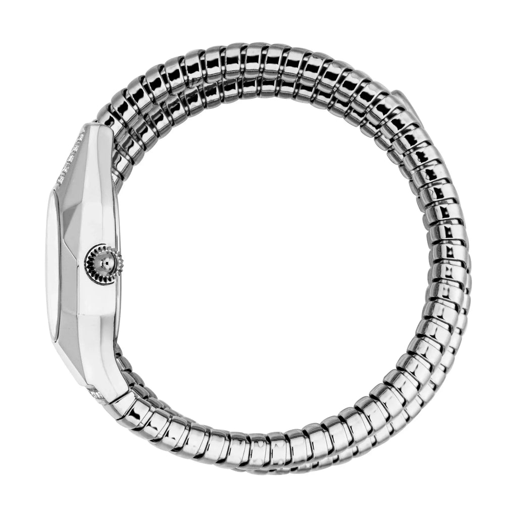 Transcend this sinuous and fluid silhouette in a mirror-polished silver radiance that reflects the vibrant city skyline with the brilliant play of light dancing across delicate crystal accents of a sophisticated and magnetic character. Essential lines and reflections that enhance the wrist, designed for high-end rooftop events and glamorous urban nights with a vanguard touch that defines every look.