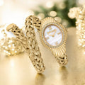 The watch is made of 316L stainless steel. Features include a quartz movement, a dial adorned with crystals and the brand logo, mineral glass, 3 ATM water resistance, a knurled crown, and a snake-shaped bracelet.