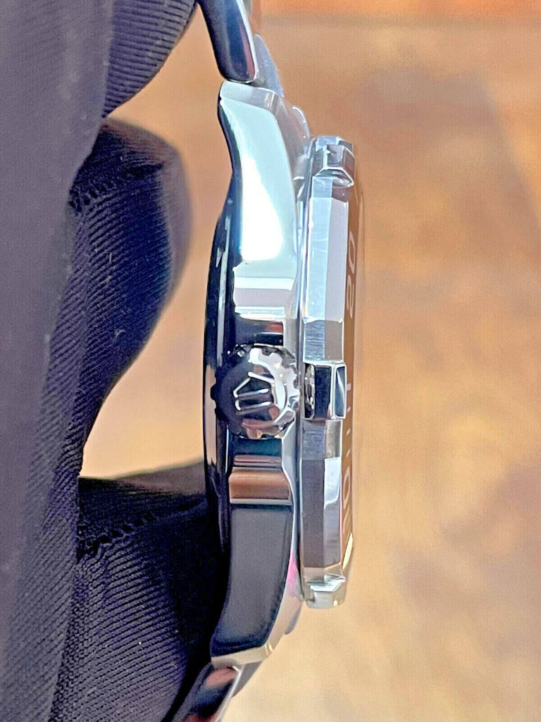 A quartz men's watch with black dial, black aluminum bezel and 41mm case in fine-brushed and polished stainless steel. Rugged and handsome, it is designed for the depths, and reliable in even the most challenging conditions.